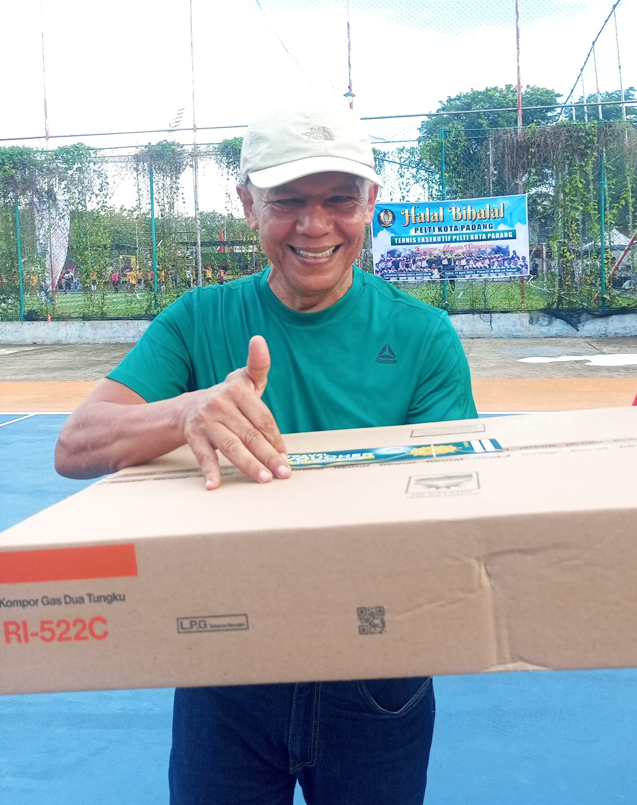Padang — Penggiat Tenis kategori veteran di Kota Padang, Sumatera Barat, Donmarma (66) meraih hadiah istimewa Turnament Tenis Eksekutif yang digelar Pelti Pengurus Kota (Pengkot) Padang, setelah mengumpulkan poin tertinggi di Lapangan Tenis GOR H Agussalim Padang, pada Sabtu (11/4/2026).