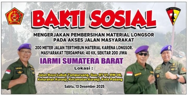 “Kami keluarga besar IARMI Sumbar dengan agenda Bakti Sosial, pada Sabtu, 13 Desember 2025 telah bergotong royong bersama warga dari pagi hingga petang di Lubuk Tampuruang, Guo, Kuranji, sehingga 40 KK atau sekitar 200 jiwa masyarakat terdampak tidak terisolasi lagi,” ujar Ketua DPP IARMI Sumbar, Drs Budhi Erwanto, MM didampingiDr. Zarfinal, SH, MH (sekretaris) Helmaydar, SS (bendahara) dan Rinaldi, SE.(Dansatgas) kepada wartawan media ini, Senin (15/12).