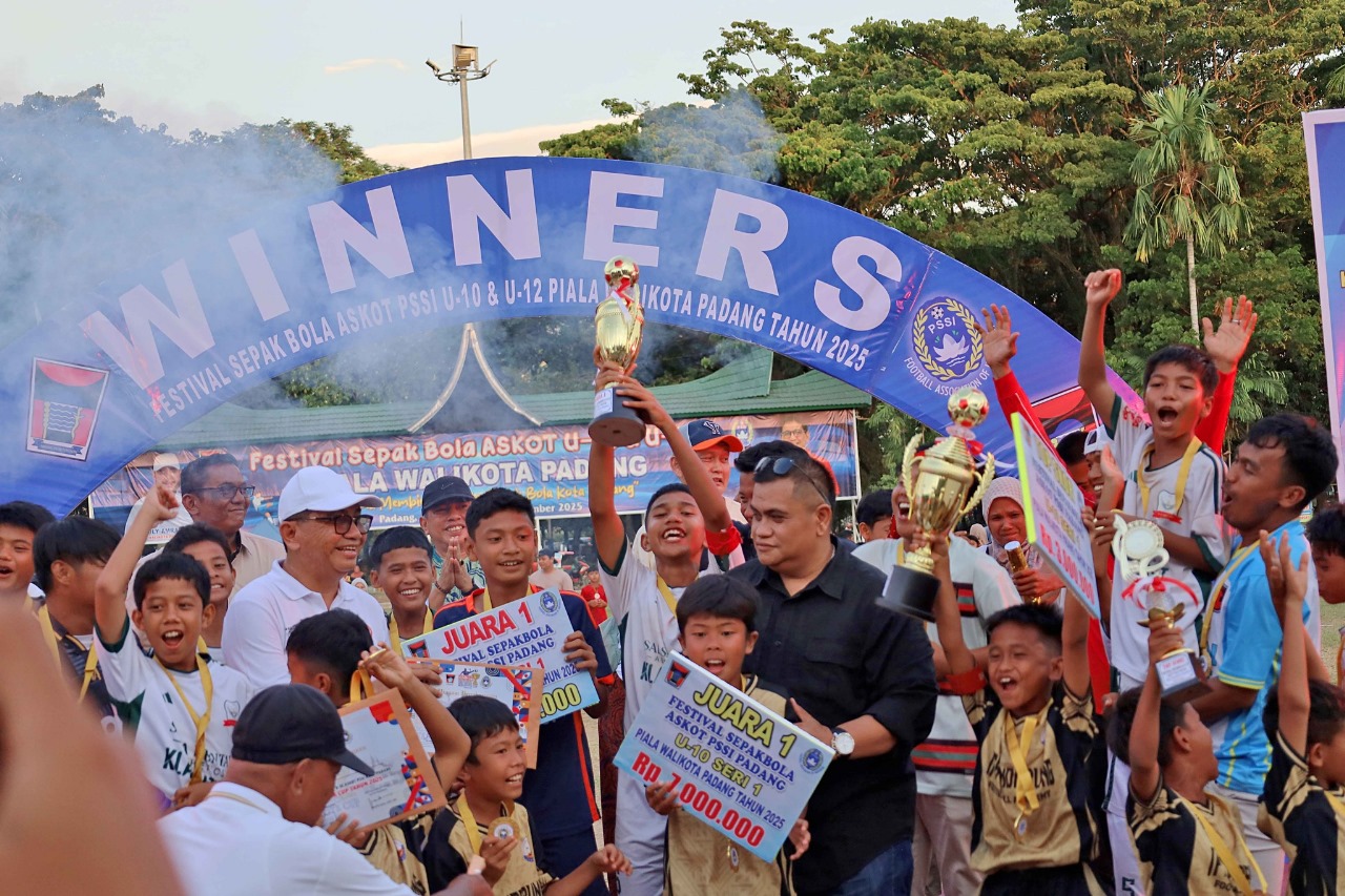 PADANG– Festival Sepakbola Askot PSSI Kota Padang U-10 dan U-12 Piala Wali Kota Padang 2025 resmi ditutup Wali Kota Padang yang diwakili Staf Ahli Bidang Kemasyarakatan dan SDM, Syahrial Kamat, di Lapangan RTH Imam Bonjol, Minggu (2/11/2025).