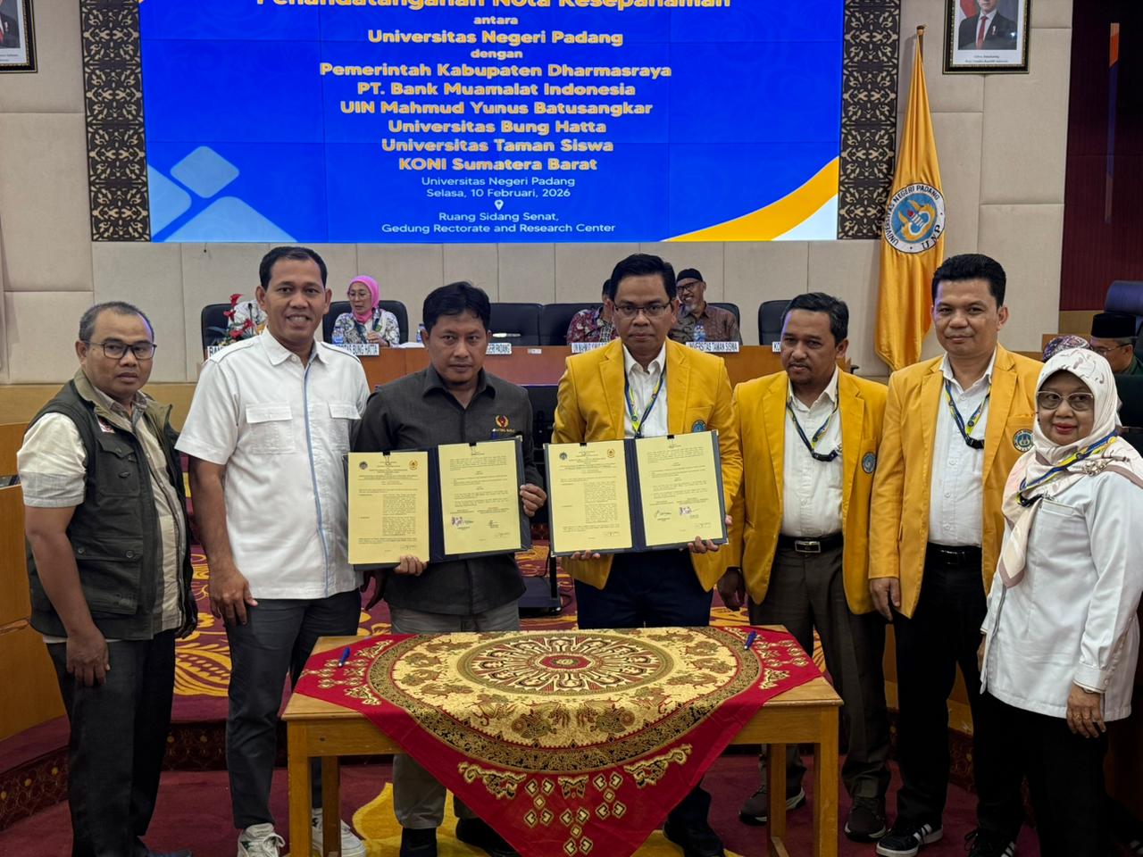 PADANG— Komite Olahraga Nasional Indonesia (KONI) Sumatera Barat resmi menjalin kerja sama dengan Universitas Negeri Padang (UNP) melalui penandatanganan nota kesepahaman (MoU) yang berlangsung di Ruang Sidang Senat, Gedung Rectorate and Research Center UNP, Selasa (10/2/2026).