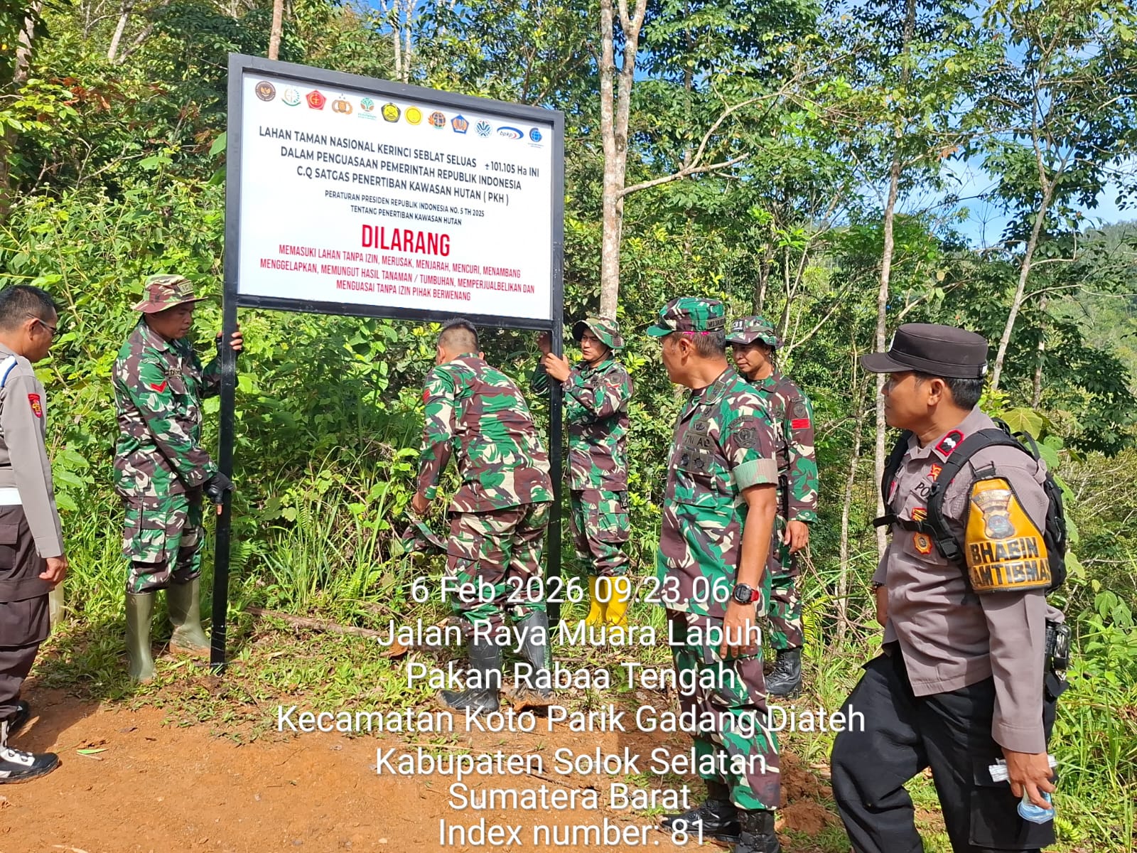 Sementara itu, Satgas PKH yang dipimpin oleh Kolonel Kav. Mujahidin turut melakukan pemasangan patok dan plang PKH sebagai penanda kawasan hutan yang dilindungi dan tidak boleh dimasuki atau dimanfaatkan tanpa izin dari pihak berwenang.