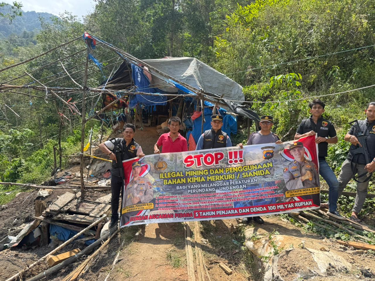 Pada akhir kegiatan, tim satgas yang dipimpin langsung Kapolsek Koto Parik Gadang Diateh, Taufik Indra, bersama personel melakukan pemasangan spanduk imbauan bertuliskan “Stop Illegal Mining” serta larangan penggunaan bahan kimia merkuri dan sianida dalam aktivitas pertambangan.