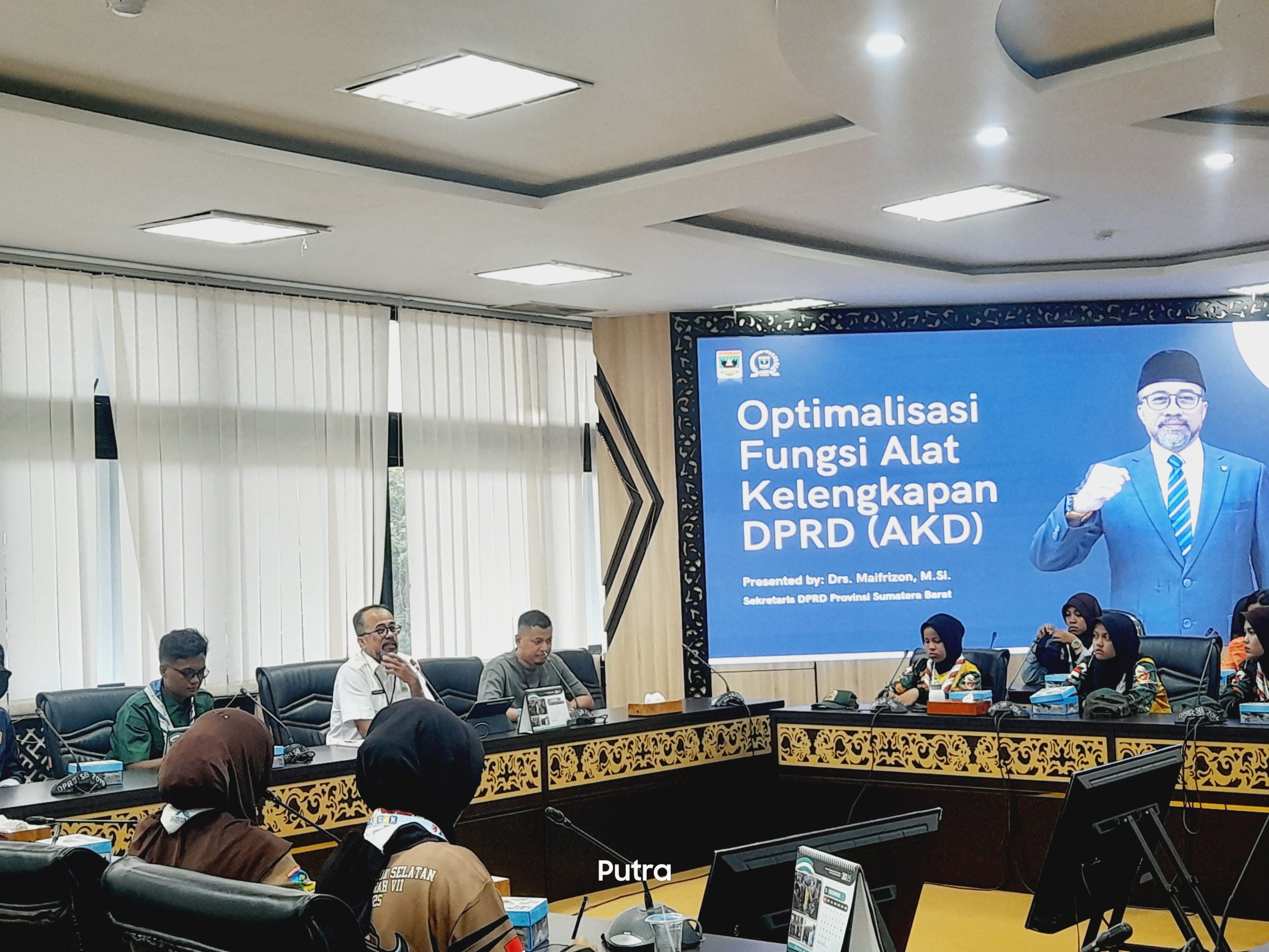 Rombongan diterima langsung oleh Sekretaris DPRD Sumbar, Maifrizon, yang tampil sebagai narasumber utama dalam memberikan pemahaman seputar mekanisme kerja wakil rakyat. Ia turut didampingi Kasubag Humas dan Protokol, Dahrul Idris.