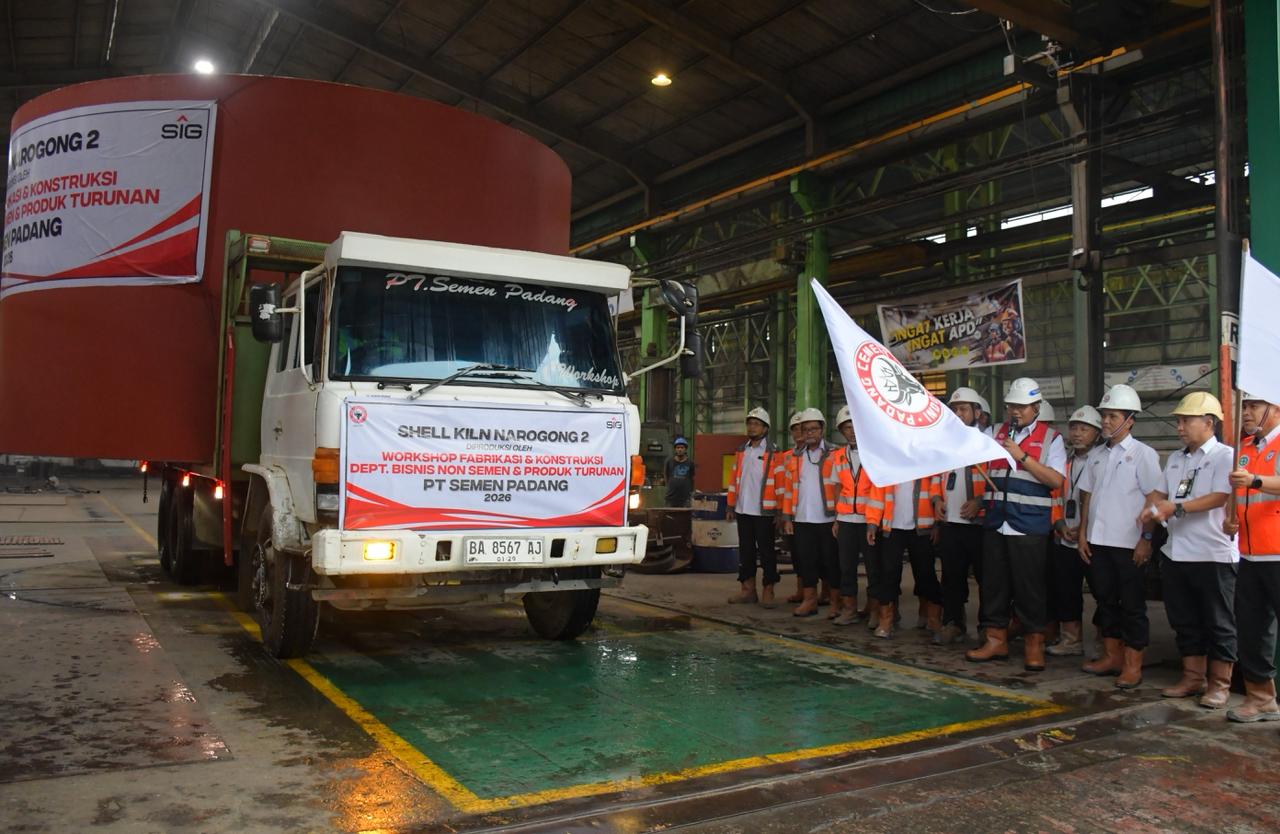 PADANG — PT Semen Padang kembali menunjukkan transformasi bisnisnya dengan melepas produk fabrikasi industri berat, Shell Kiln Narogong 2, yang dipesan oleh PT Solusi Bangun Indonesia Tbk.